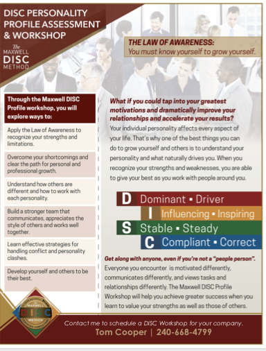 The first five people who contact me to learn more will receive a FREE DISC personalized assessment and 1-1 live DISC coaching session. $197 value! Click the button below to send me an email. If you’re one of the first five, I’ll contact you immediately with instructions for your FREE DISC assessment.