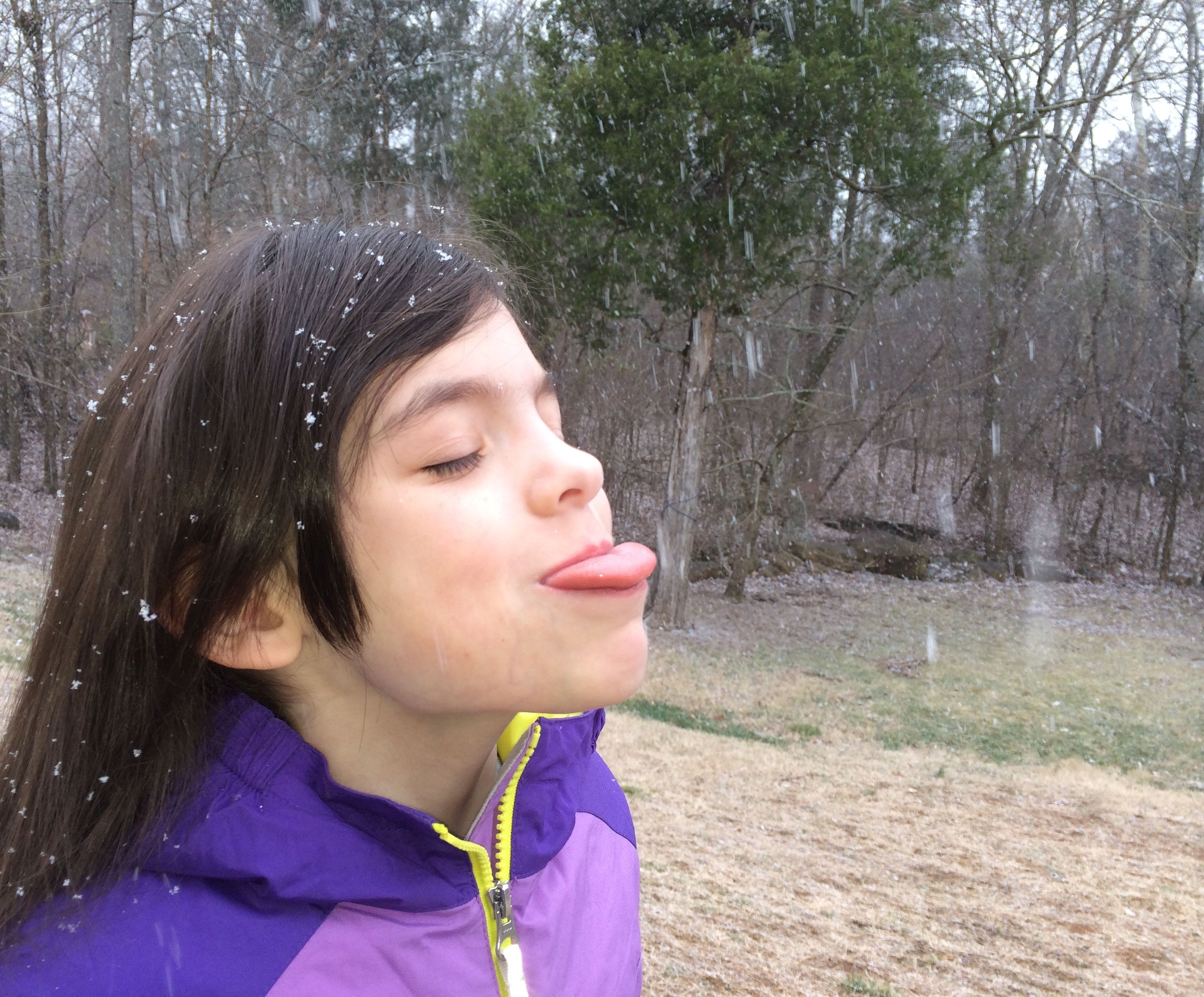 Our family is having a blast making snowballs and sliding down the hills. Here’s a shot of my oldest girl catching snowflakes on her tongue.